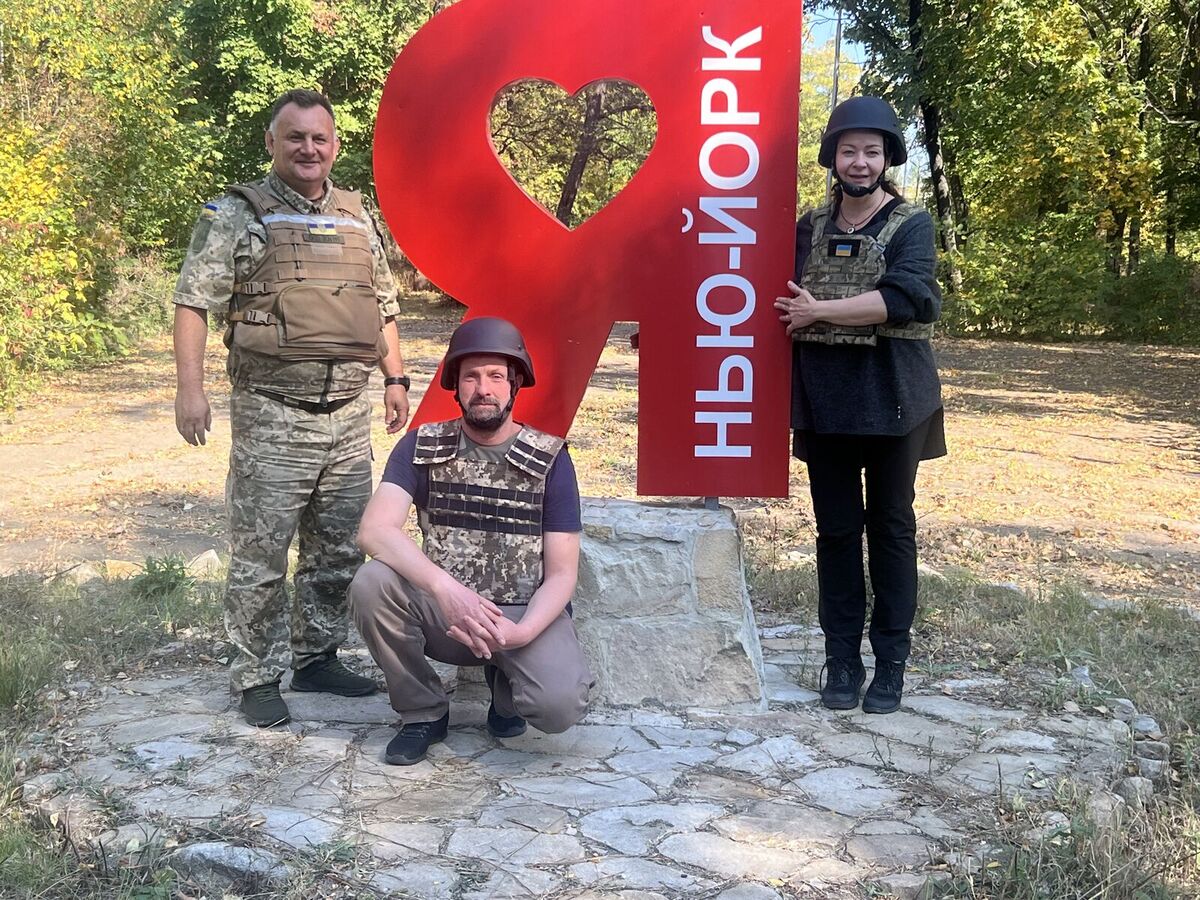 Руслан Біленко та співзасновники ГО "Український центр 'Простір Гідності'" - Карл Плеснер і Олена Ганцяк-Каськів. Селище Нью-Йорк, міська громада Торецького району, жовтень 2023 р.
