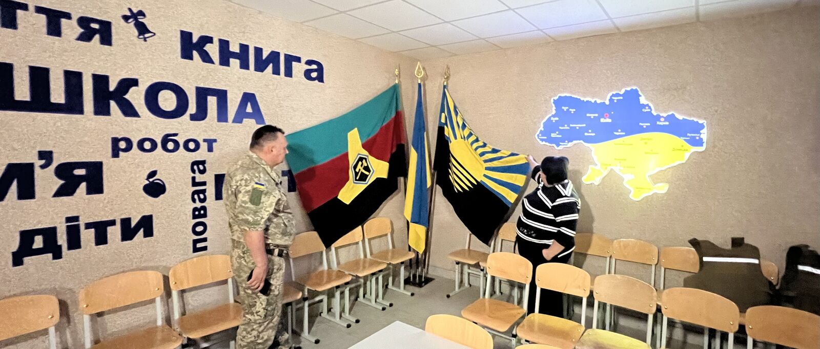 Руслан Біленко біля прапору міста Торецька (праворуч) та Ольга Гарюк, керівниця пункту Незламності Торецької ВЦА біля прапору Донецької області (ліворуч) у пункті Незламності Торецької ВЦА.