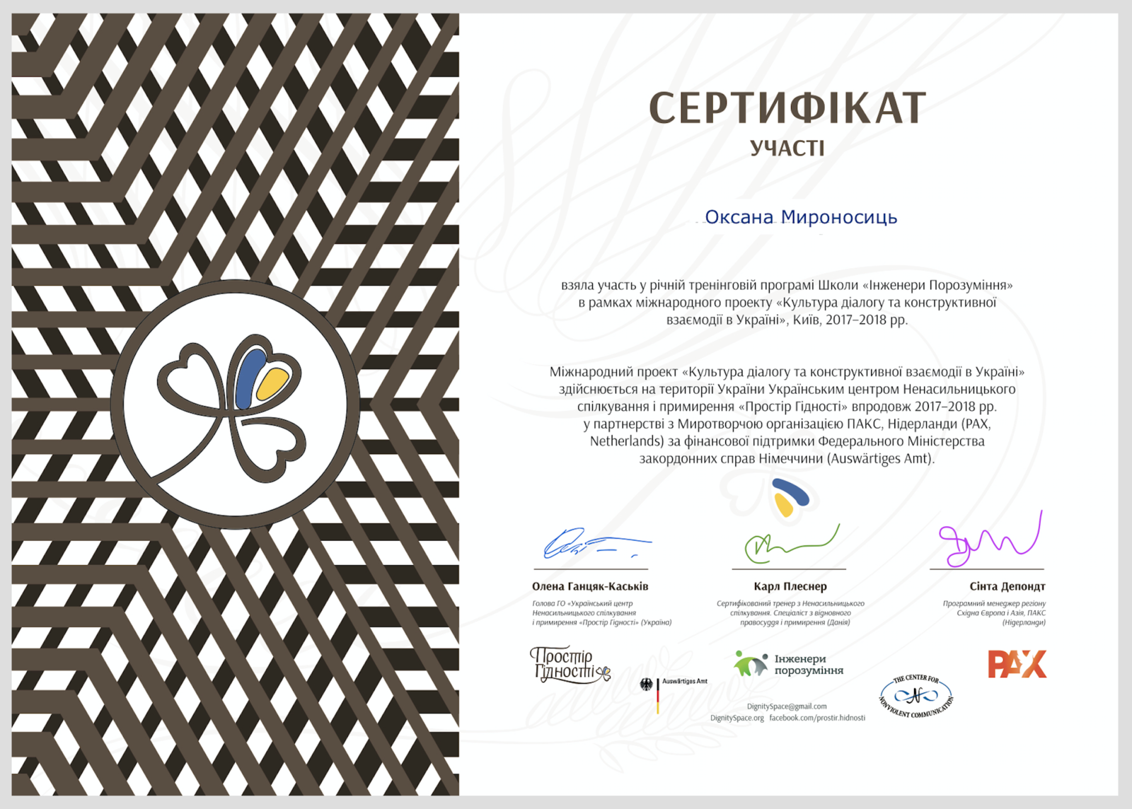 Приклад сертифікату участі у Школі Інженерів Порозуміння